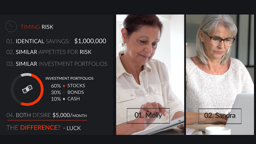 Molly and Sandra are the same age, have the same amount of savings and are taking the same monthly income. How is it that Sandra loses $416,000 compared to Molly in only 4 years? Watch the movie! Don't leave your retirement security to good luck, or bad.